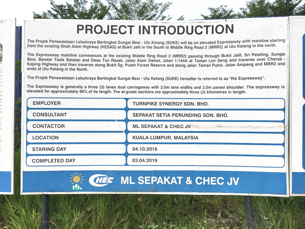 SUKE CA4項(xiàng)目是由中交集團(tuán)中國(guó)港灣工程有限責(zé)任公司承建的高速公路項(xiàng)目。項(xiàng)目起于吉隆坡皇家警察學(xué)院附近,跨越既有高速公路,MRT輕軌,穿越森林保護(hù)區(qū),止于吉隆坡塔曼武吉塞加爾附近,橋區(qū)內(nèi)主要為山嶺重丘地形及現(xiàn)有道路兩側(cè)。橋梁共計(jì)18座,共11129米。路基共19處,共4348.9米。