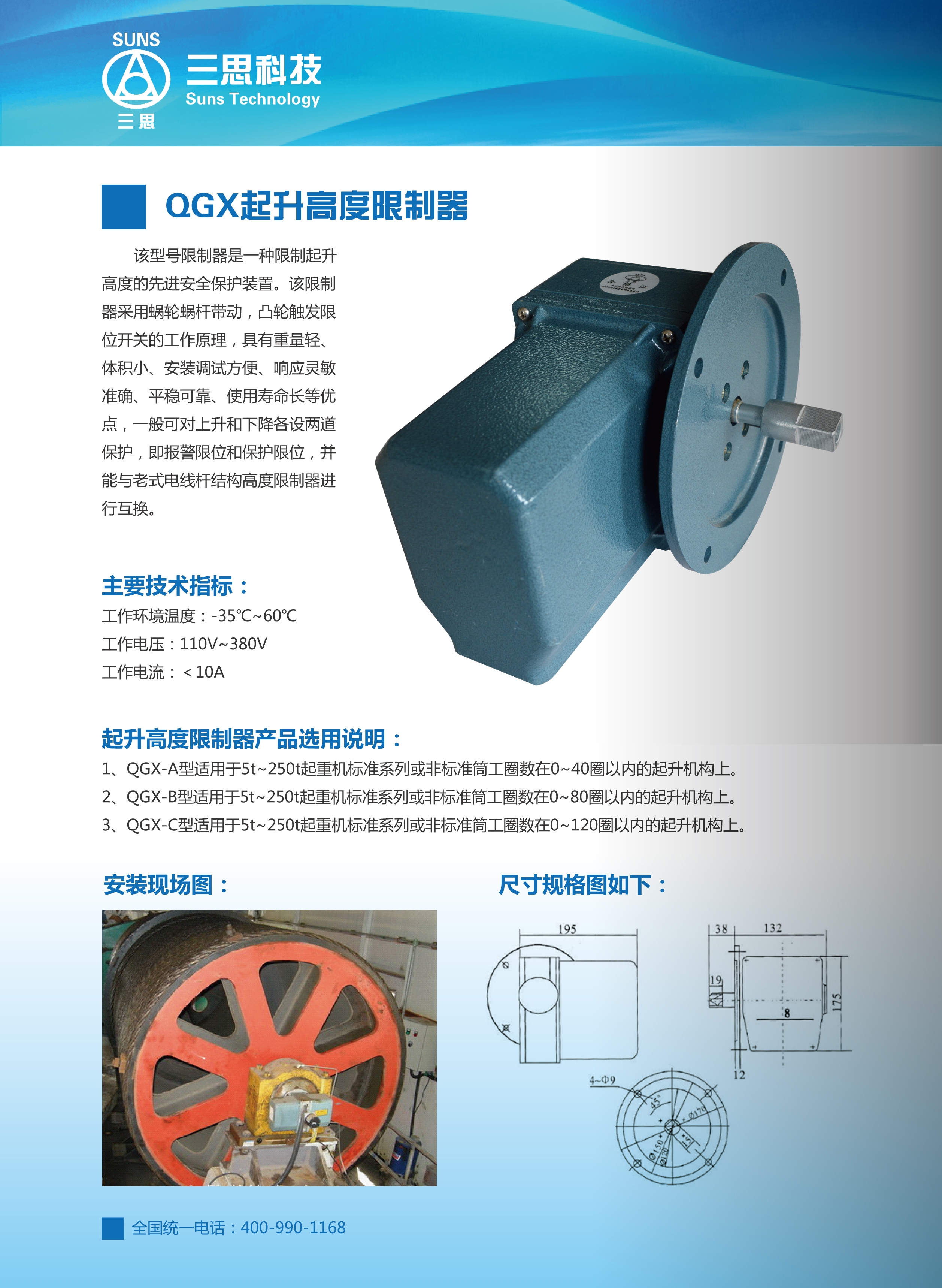 該型號(hào)限制器是一種限制起升高度的先進(jìn)安全保護(hù)裝置。該限制器采用蝸輪蝸桿帶動(dòng),凸輪觸發(fā)限位開關(guān)的工作原理,具有重量輕、體積小、安裝調(diào)試方便、響應(yīng)靈敏準(zhǔn)確、平穩(wěn)可靠、使用壽命長等優(yōu)點(diǎn),一般可對(duì)上升和下降各設(shè)兩道保護(hù),即報(bào)警限位和保護(hù)限位,并能與老式電線桿結(jié)構(gòu)高度限制器進(jìn)行互換。
