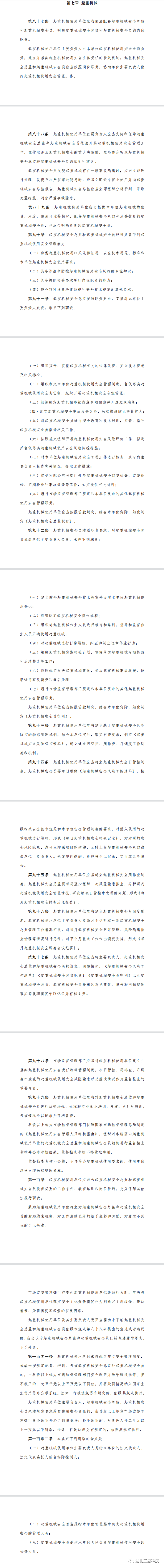以下是《特種設(shè)備使用單位落實使用安全主體責任監(jiān)督管理規(guī)定》第七章針對起重機械做出如下規(guī)定: