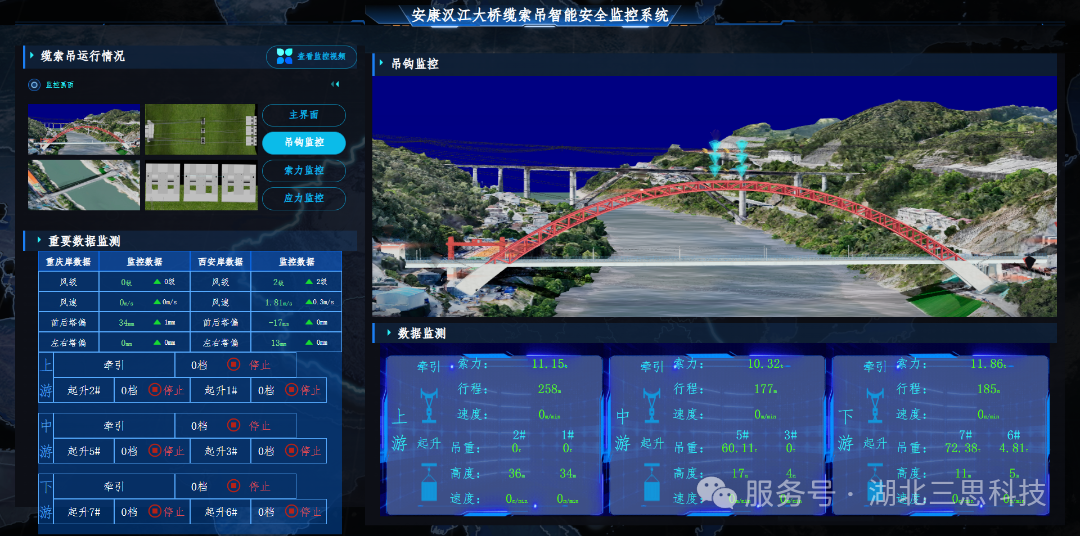廣西漓江特大橋全長717米,其中主橋為190米下承式鋼管混凝土系桿拱橋,單條拱肋分為8個節(jié)段,全橋共16個節(jié)段,最長節(jié)段約29.64米,最重節(jié)段達67.84噸,是整個桂林外環(huán)高速項目的重要組成部分。拱肋節(jié)段采用“纜索吊裝+斜拉扣掛”施工工藝進行安裝,建造難度大、技術水平要求高。本纜索吊安全監(jiān)控系統(tǒng)采用的是由湖北三思科技依據(jù)國標《起重機械安全監(jiān)控管理系統(tǒng)》GB/T28264-2017相關規(guī)定自主研發(fā)的SSL-CB型纜索吊安全監(jiān)控管理系統(tǒng),監(jiān)測纜索吊的起吊、牽引索力,運行行程數(shù)據(jù),起升高度數(shù)據(jù),限位數(shù)據(jù),操作指令數(shù)據(jù)以及輸出控制點位,可以讓駕駛員全方位掌握纜索吊的實時運行狀況,提高了操作的安全性。