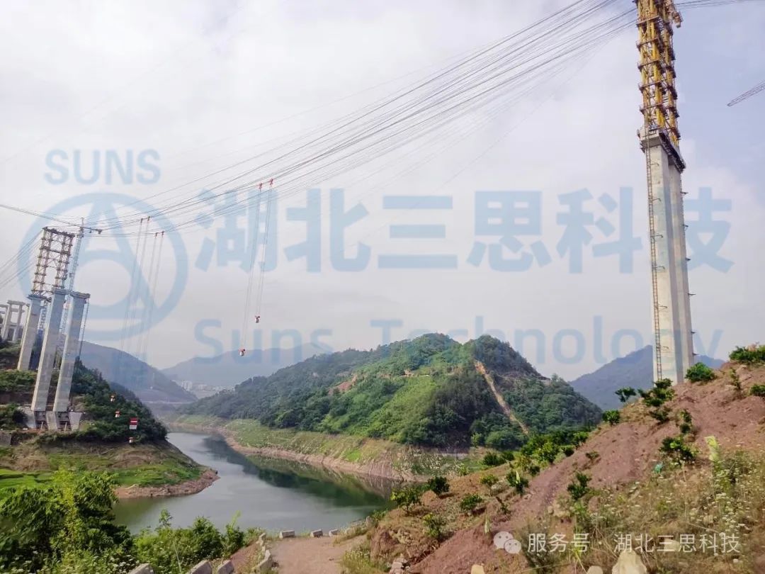 北流河特大橋主拱采用鋼管混凝土四肢全桁式結構,整束擠壓鋼絞線吊索體系,主拱計算跨徑為270m ,計算矢高 67.5m。北流河特大橋采用貝雷桁架主塔結構,吊扣一體化纜索吊體系。其中北塔高101.8m,南塔高105.8m,起重能力為2×95t,創(chuàng)同類型纜索吊高度國內(nèi)第一,同高度吊重國內(nèi)第一的“雙創(chuàng)”紀錄。5月30日,由湖北三思科技參與的北流河大橋纜索吊集中控制系統(tǒng)正式亮相荷載試驗。本系統(tǒng)的成功運用,將大幅提升施工安全系數(shù),有力保障了吊裝作業(yè)零失誤。