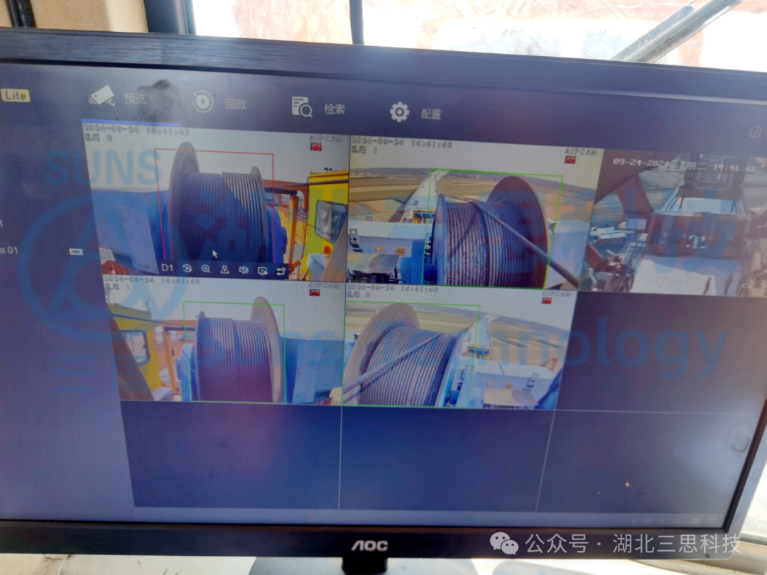 安裝AI攝像頭監(jiān)控卷揚(yáng)機(jī)的鋼絲繩排繩情況,在顯示器上可顯示鋼絲繩亂繩情況,若出現(xiàn)亂繩,顯示提示現(xiàn)場人員檢查。