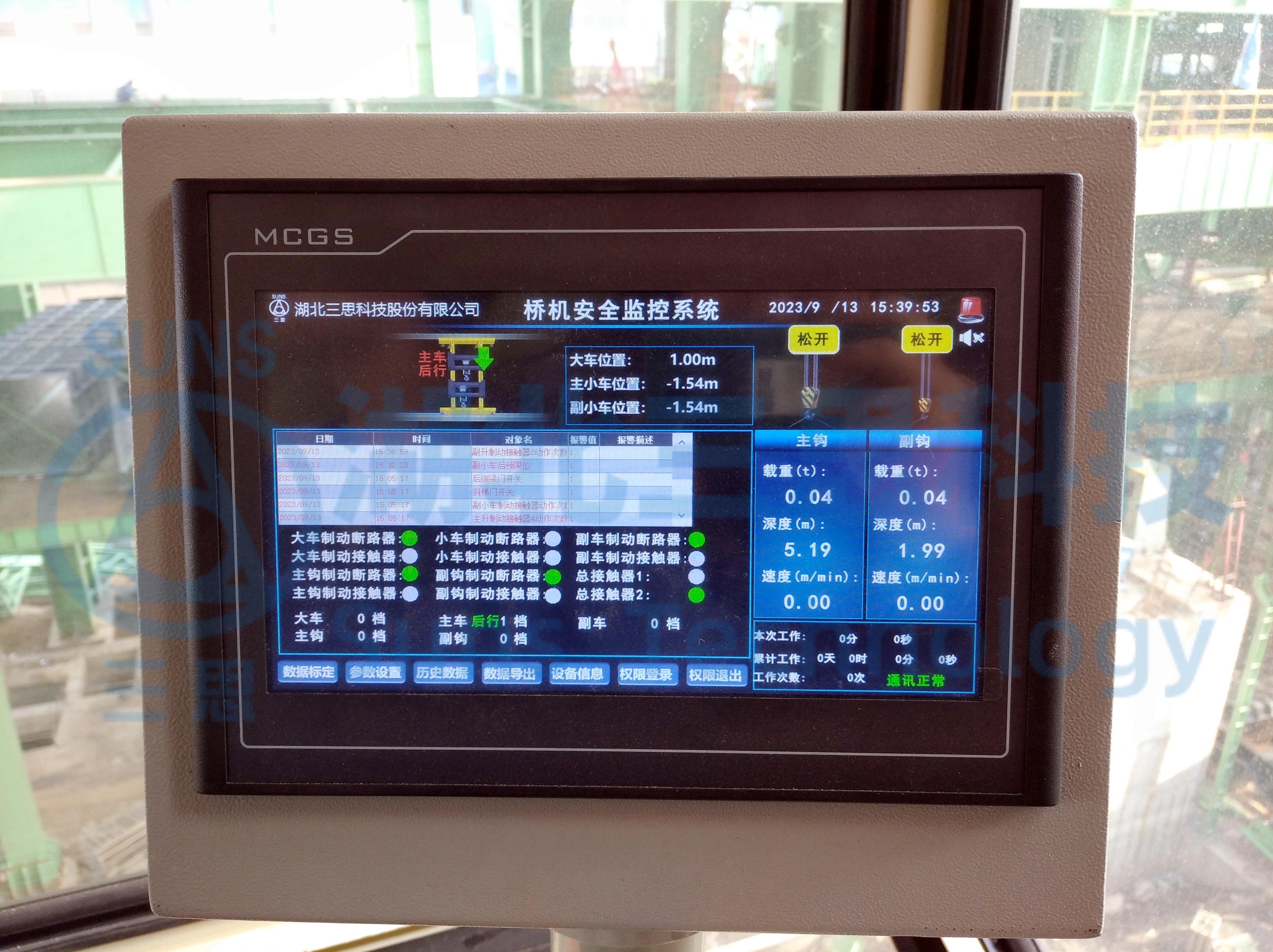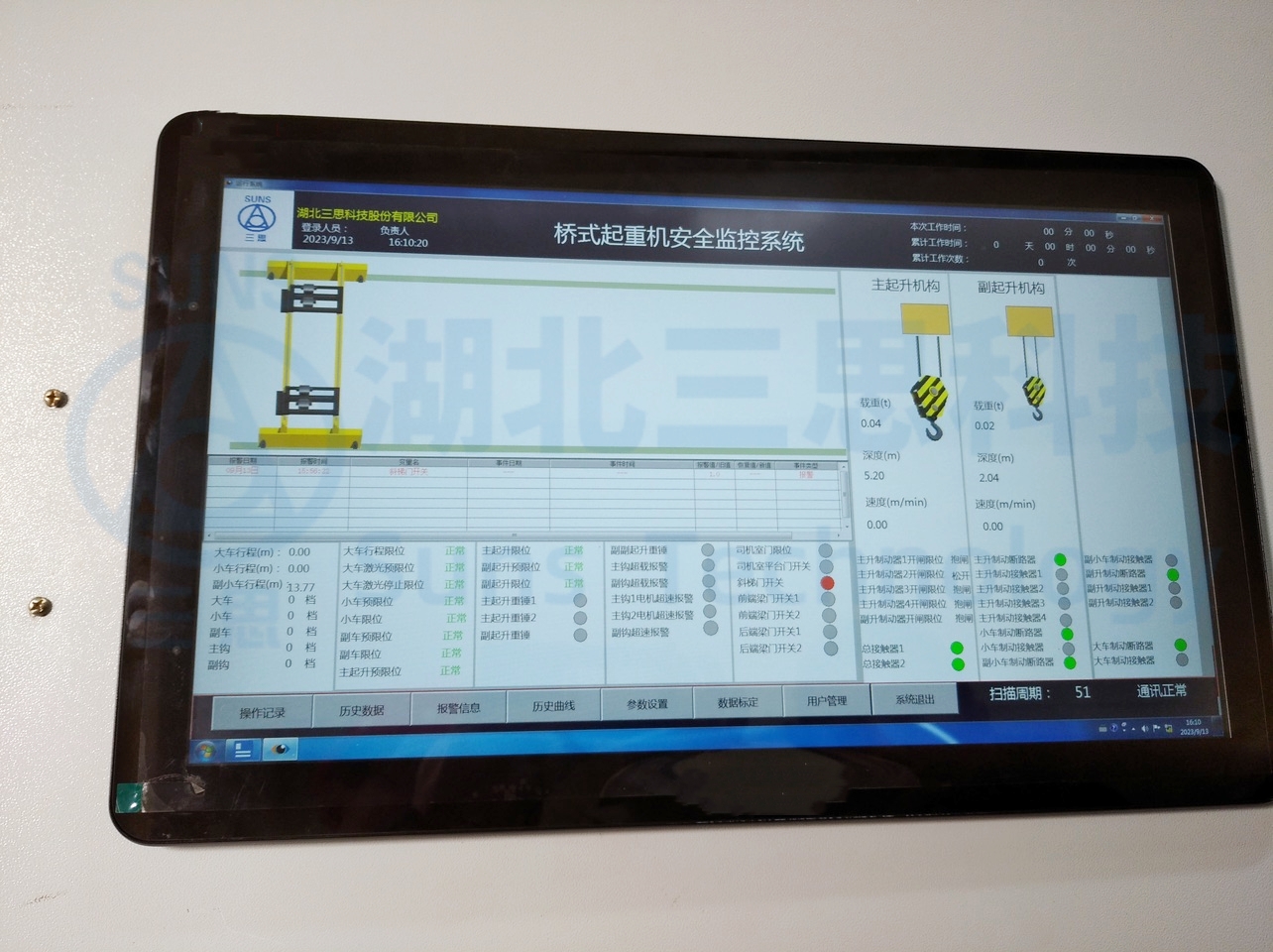系統(tǒng)實時報警畫面及歷史報警畫面,記錄起重機(jī)運(yùn)行過程中的各種故障報警和設(shè)置報警,如:超載報警,門限位報警,主副鉤上限報警,天車行程報警,限位報警等,并且在故障發(fā)生時發(fā)出聲光報警,以及及時提醒駕駛員。